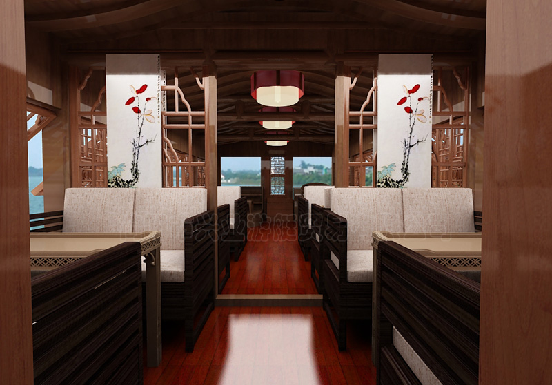 嵌鋼化玻璃,客艙上下采用浮雕花格,使整個游艇達到仿古的效果。舷內(nèi)外機和舷外機上