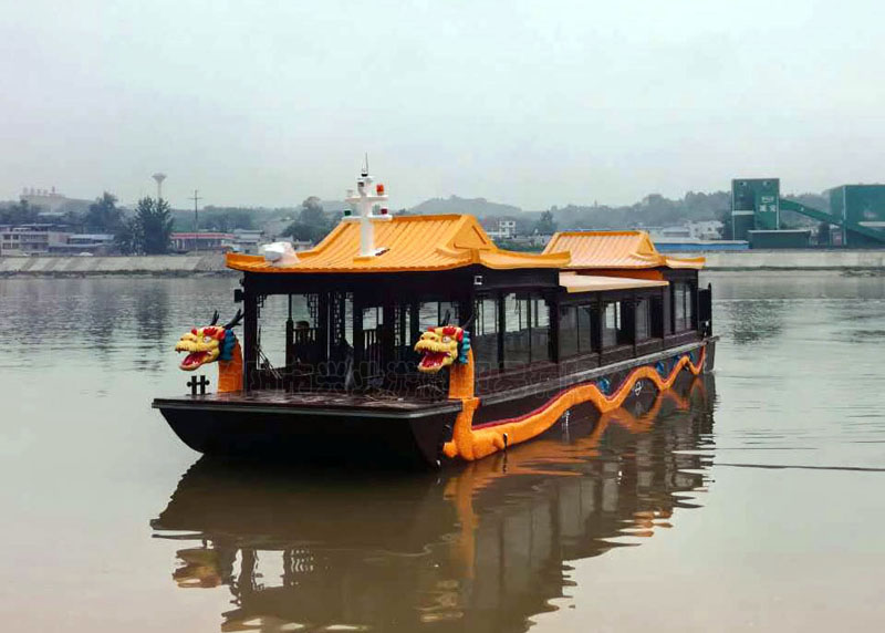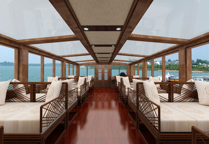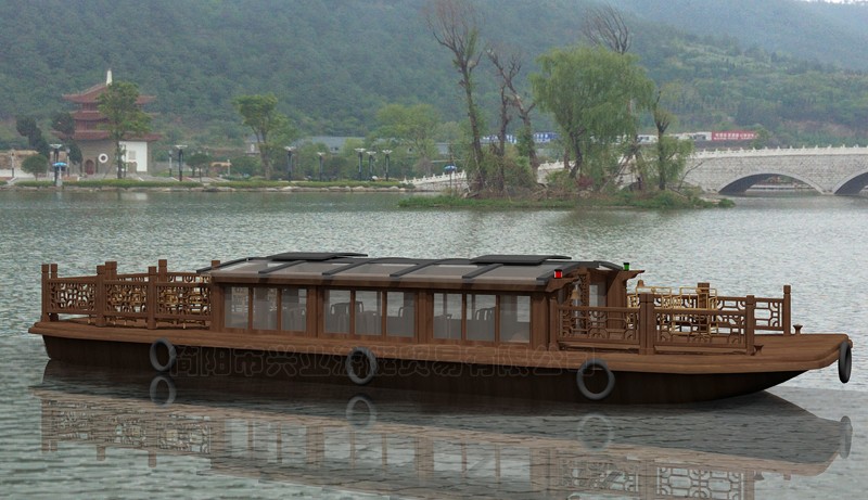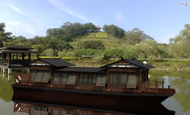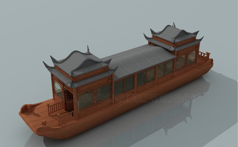 甲板及畫舫屋頂均采用玻璃鋼制造,上層結(jié)構(gòu)采用木機構(gòu)畫舫造型。墻面采用鋁合金窗鑲