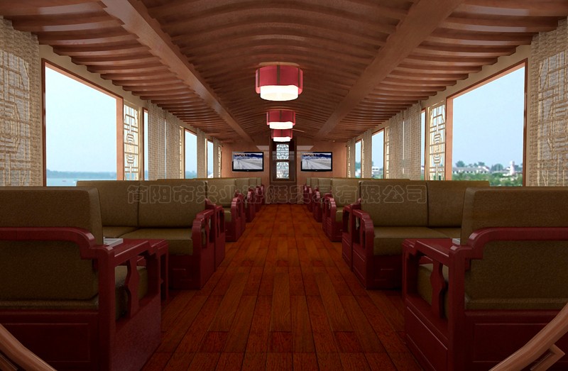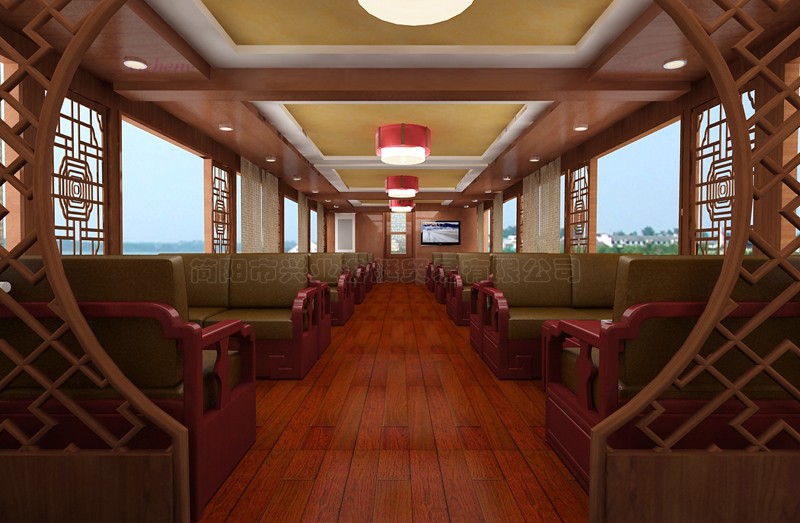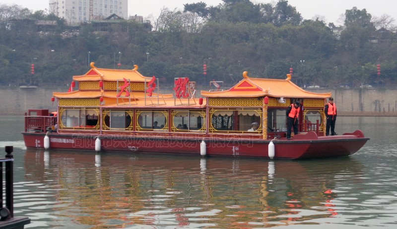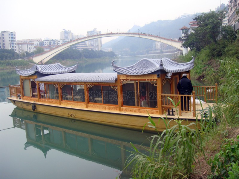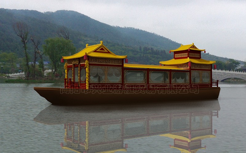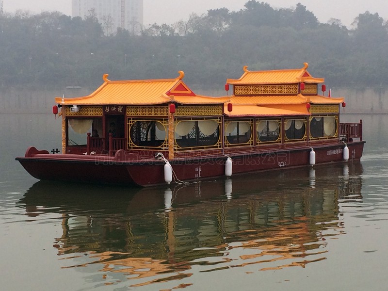 本船為玻璃鋼船體,上層木質(zhì)畫舫結(jié)構(gòu),采用單體折角艇體線型,在艉艙內(nèi)布置2臺進口環(huán)保型高轉(zhuǎn)速舷內(nèi)外柴油機推進裝置作為本船的動力,通過設(shè)于艉封板外的舷外艉機(或螺旋槳、軸系)的左右轉(zhuǎn)動,達到操舵的作用,是水上旅游、觀光、娛樂的理想選擇。
