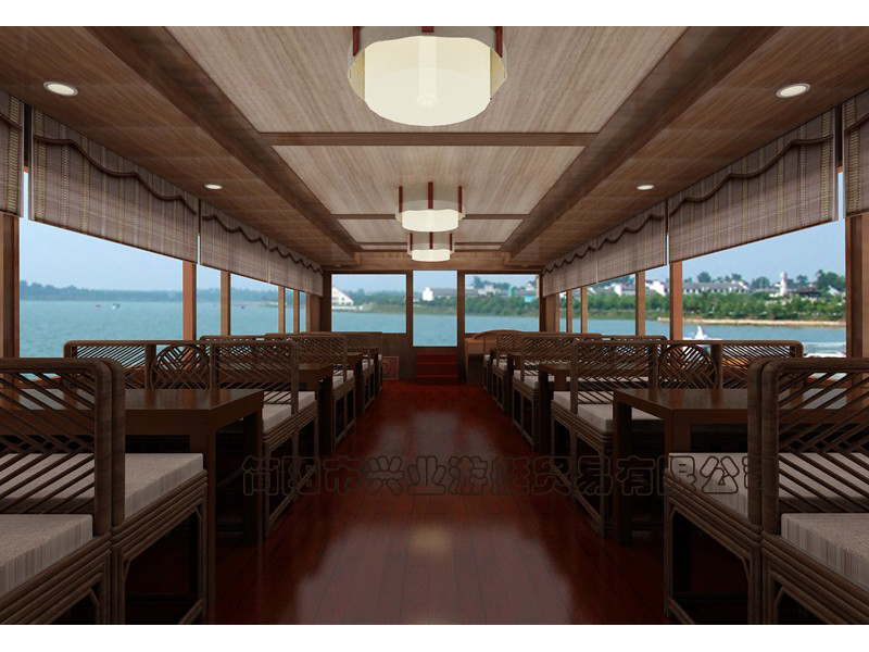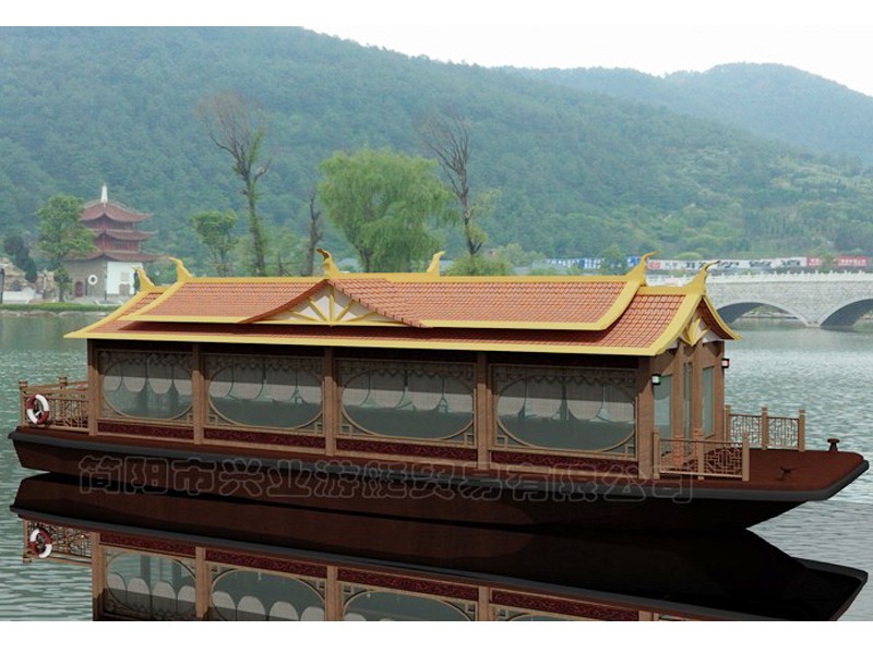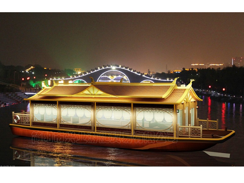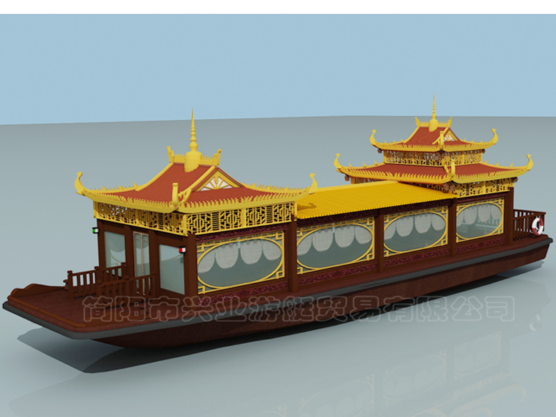 甲板及畫舫屋頂均采用玻璃鋼制造(主船體也可采用鋼質(zhì)),上層結(jié)構(gòu)采用木機構(gòu)畫舫造